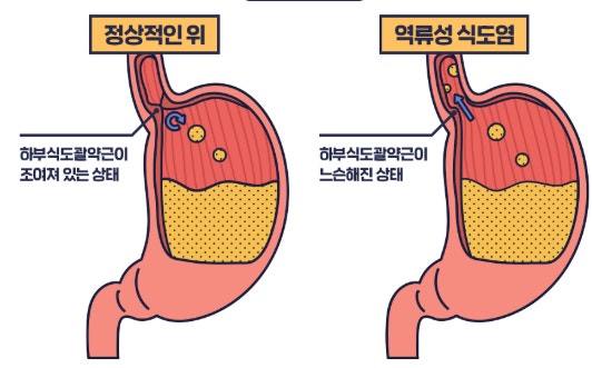 역류성식도염은 위장에 있는 내용물이 식도로 역류하면서 식도의 점막에 염증을 일으키는 질환으로 식도는 산에 강하지 않기 때문에 반복적인 역류가 있을 경우 염증은 물론 궤양이나 출혈로 이어질 수 있습니다.